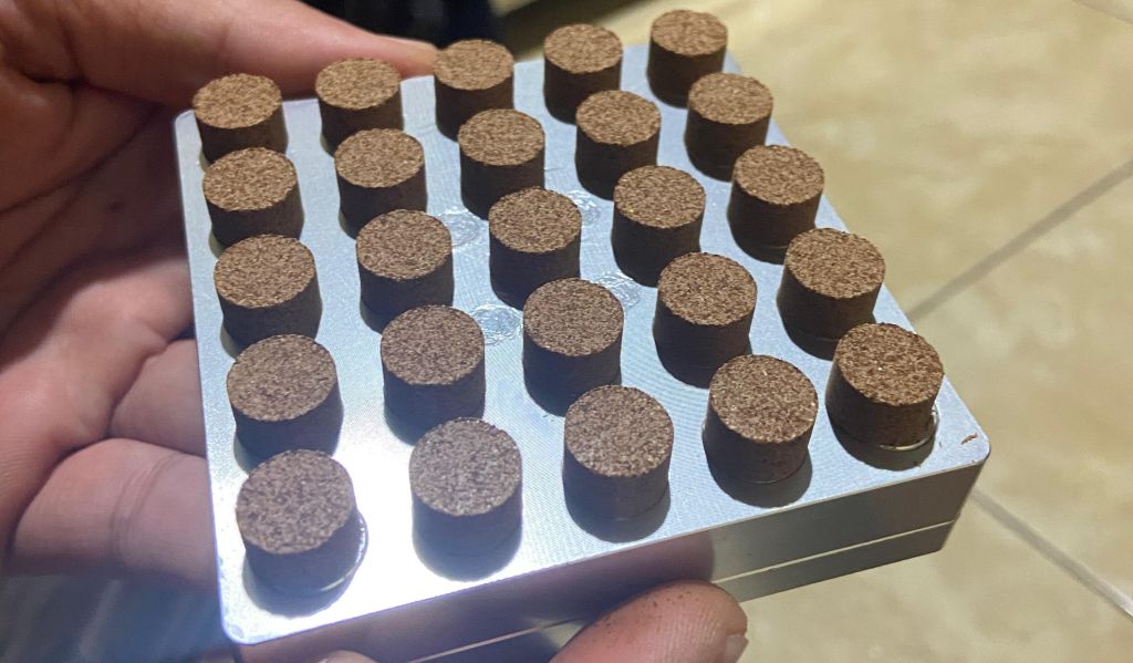 Dia menjelaskan, kegiatan pengabdian mulai dilaksanakan selama Juni sampai September 2025, diawali dengan mencari komposisi produk kopi tablet yang pas agar bentuk, warna, cita rasa, maupun aromanya sesuai dengan standar Anjosia Coffee dan selera konsumen. Tim menggunakan tiga bahan utama, yakni kopi bubuk robusta, krimer dan gula aren. Dilakukan uji coba dengan enam variasi komposisi yang berbeda-beda, sampai akhirnya ditemukan komposisi yang tepat.