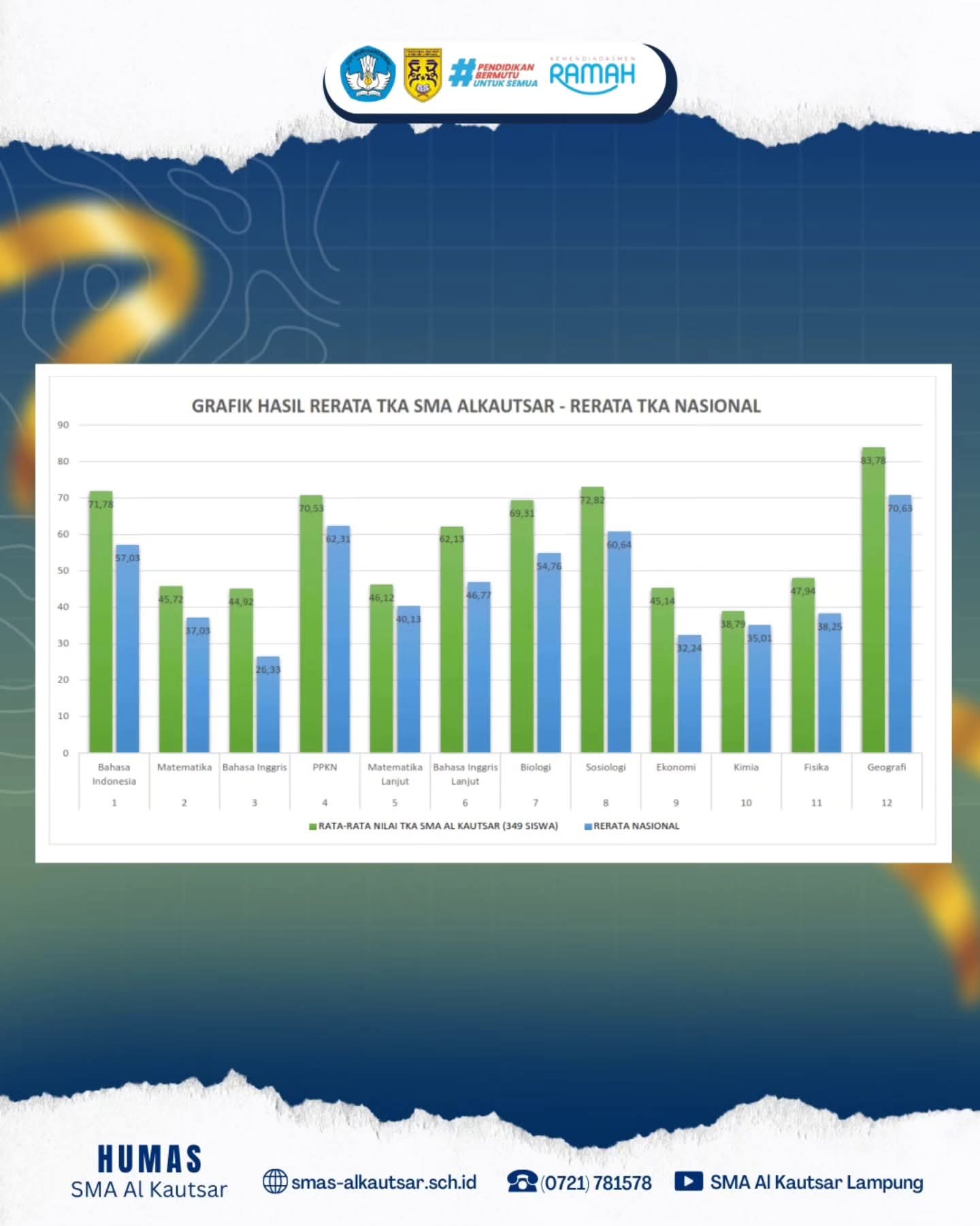 PORTALLNEWS.ID (Bandar Lampung) -Nilai rata-rata SMA Al Kautsar untuk semua mata pelajaran yang diujikan di Tes Kemampuan Akademik (TKA) berada di atas rata-rata nasional, baik mata pelajaran wajib maupun mata pelajaran pilihan. Bahkan, dua siswa SMA Al Kautsar berhasil mencapai nilai 100 pada mata pelajaran Fisika atas nama Muhammad Aksan Fitriyadi, dan Biologi atas nama Ahmad Faiz Akbar.