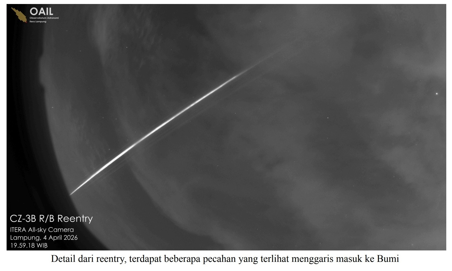 PORTALLNEWS.ID (Lampung Selatan) – Tim Observatorium Astronomi Itera Lampung (OAIL) mengidentifikasi fenomena benda jatuh yang terlihat di langit Lampung pada Sabtu malam, 4 April 2026, sebagai sampah antariksa (space debris) berupa sisa badan roket CZ-3B R/B milik Tiongkok. Fenomena cahaya kemerahan yang disertai dentuman itu dipastikan merupakan peristiwa masuk kembali (re-entry) objek buatan ke atmosfer Bumi.