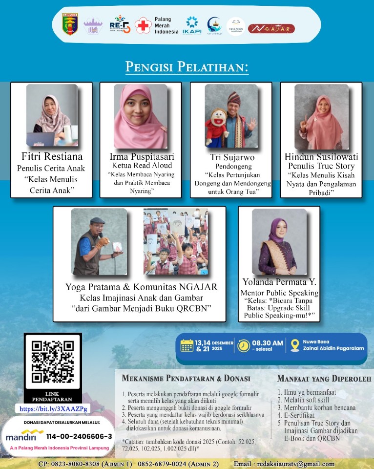Tim Literasi Provinsi Lampung menyelenggarakan “Pelatihan Pengembangan Diri” untuk penggalangan donasi korban banjir Sumatera. Semua dana yang terkumpul dari kegiatan pelatihan akan disalurkan kepada korban bencana banjir di Sumatera.