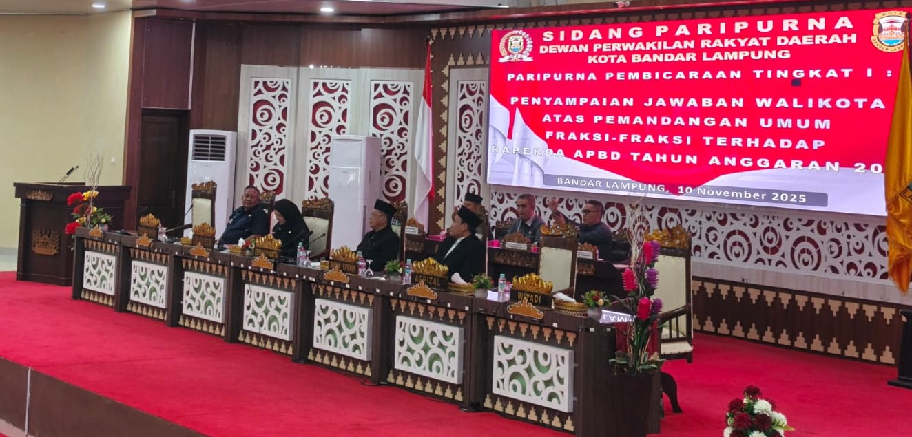 PORTALLNEWS.ID ( Bandar Lampung ) – Sidang Paripurna Pembicaraan Tingkat I DPRD Kota Bandar Lampung dengan agenda penyampaian jawaban Wali Kota atas pandangan umum fraksi-fraksi DPRD terhadap Rancangan Peraturan Daerah tentang APBD Kota Bandar Lampung Tahun Anggaran 2026, pada Senin, 10 November 2025.