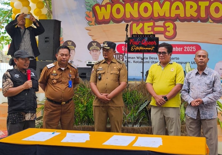 Penandatanganan kerja sama program desa binaan dilakukan oleh Kepala Desa Wonomarto, Waskito Yusika dengan perwakilan Kagama Lampung, Selasa, 16 Desember 2025, Taman Wisata Desa Wonomarto.