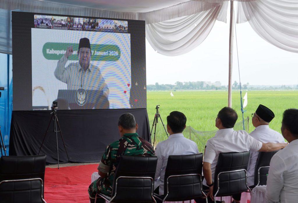 PORTALLNEWS.ID ( Pesawaran ) – Gubernur Lampung Rahmat Mirzani Djausal mengikuti Panen Raya dan Pengumuman Swasembada Pangan oleh Presiden RI Prabowo Subianto secara virtual dari Balai Desa Kutoarjo, Kabupaten Pesawaran, Rabu (7/1/2026). Kegiatan nasional tersebut dipusatkan di Karawang dan diikuti pemerintah daerah se-Indonesia.